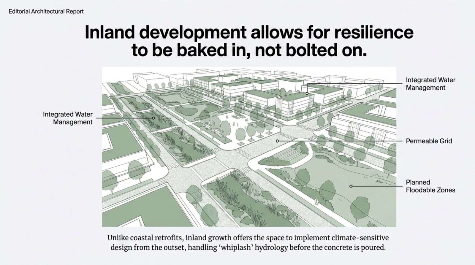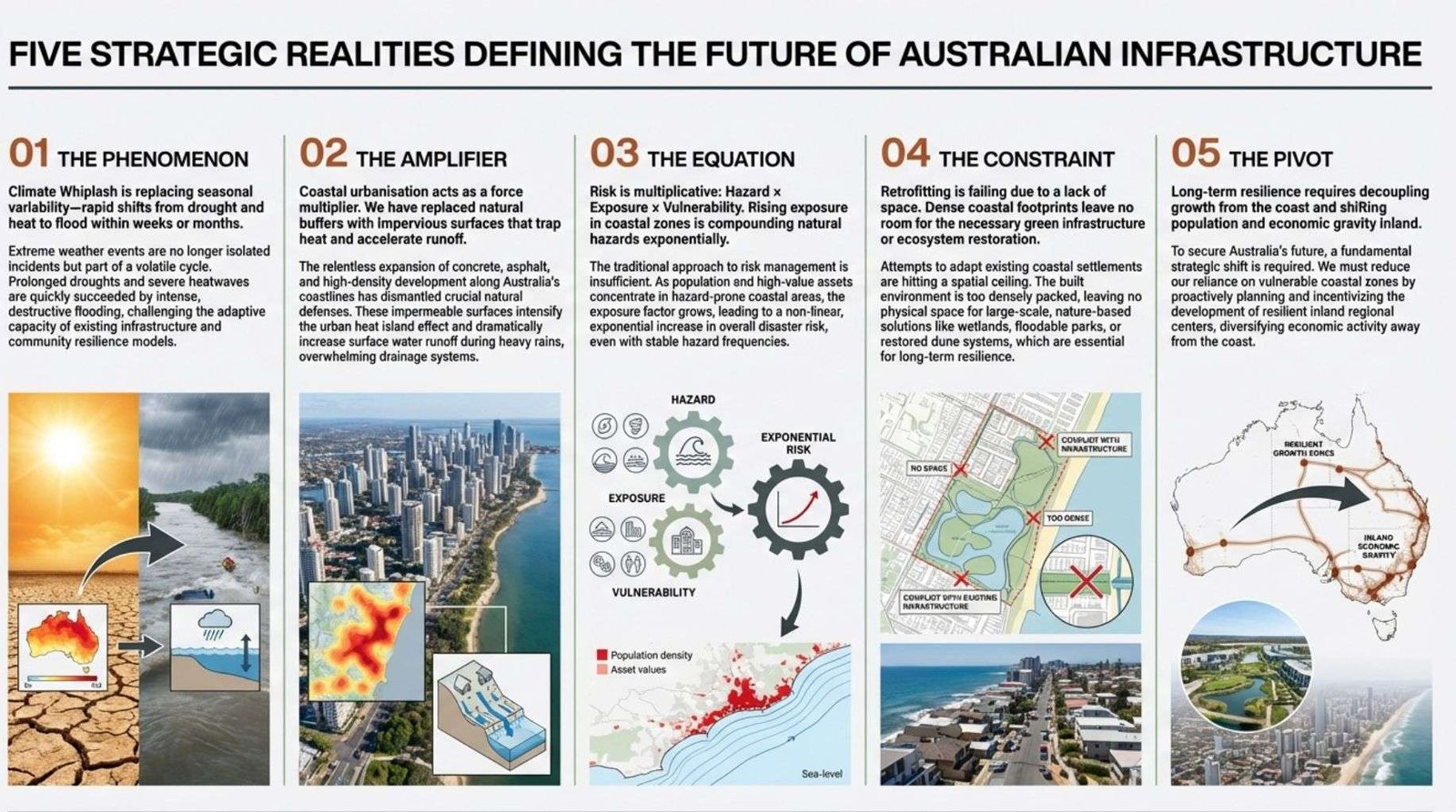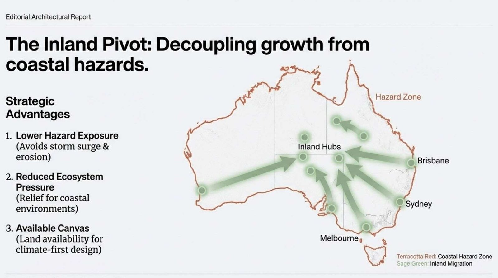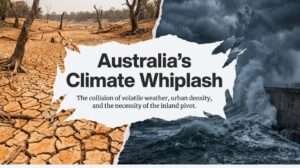 It shows how Climate Whiplash and urban density necessitate a strategic pivot inland for resilient Australian infrastructure.
