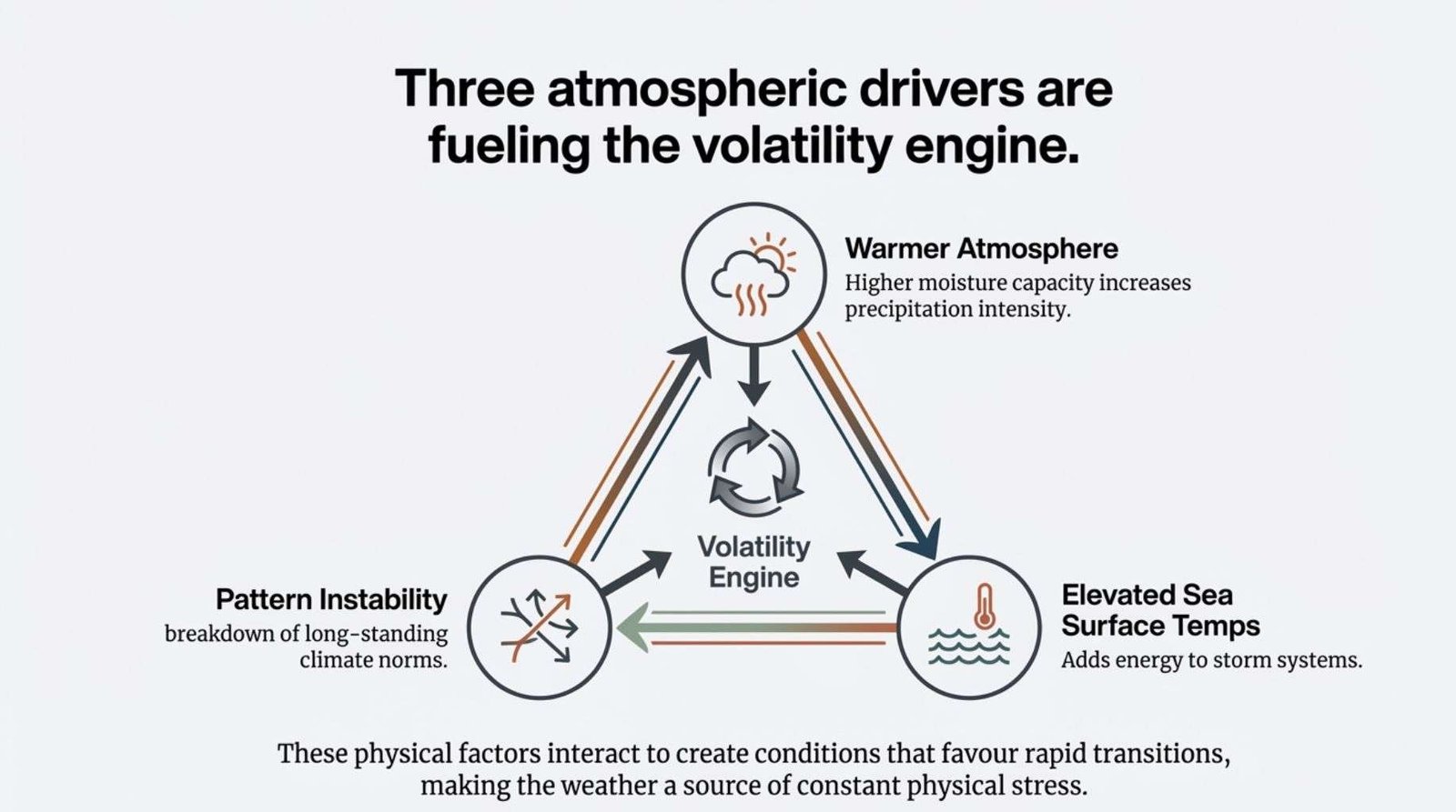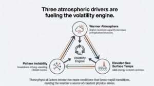 These factors interact to create conditions favouring greater volatility and more rapid transitions between weather extremes.