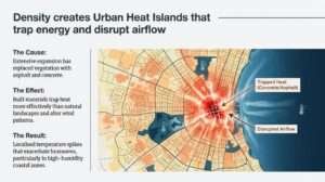 Dense development incorporating asphalt, concrete and other heat-absorbing materials creates urban heat islands.