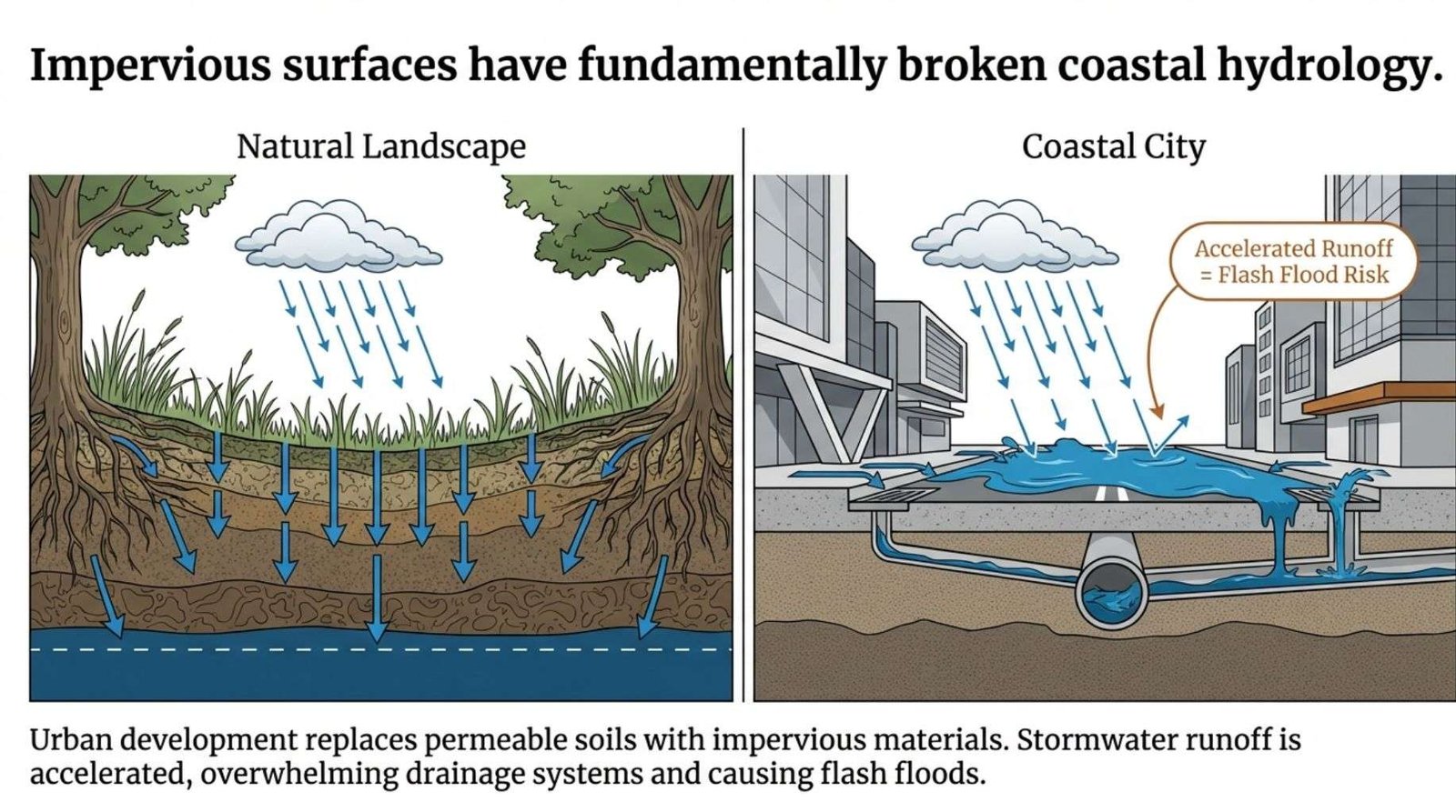 Water that would naturally infiltrate soil now flows rapidly across paved surfaces, overwhelming drainage systems and concentrating flow in ways that amplify flood damage.