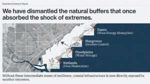Weather events that might historically have caused limited damage become costly disasters when they impact densely developed areas lacking natural buffers.