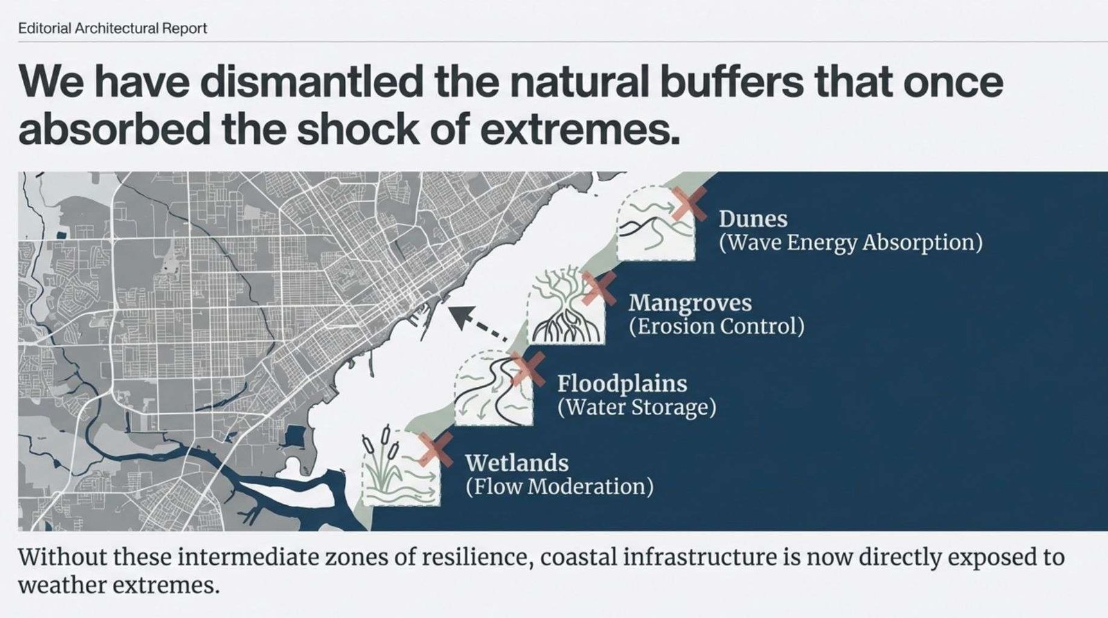 The removal of these natural buffers eliminates multiple layers of protection, leaving coastal infrastructure directly exposed to weather extremes without intermediate zones of resilience.