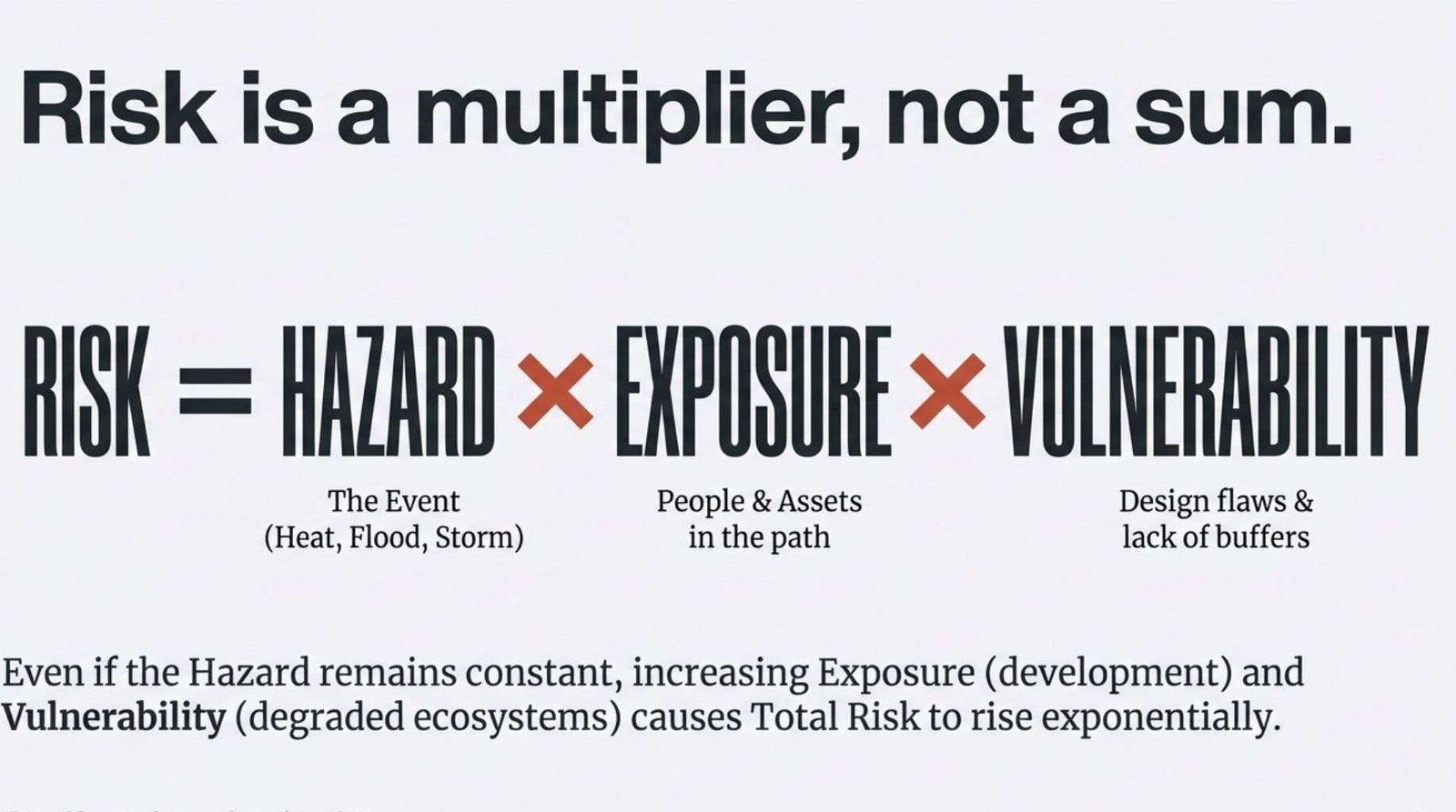 Risk science frameworks typically express risk as the product of three components: Risk = Hazard × Exposure × Vulnerability.