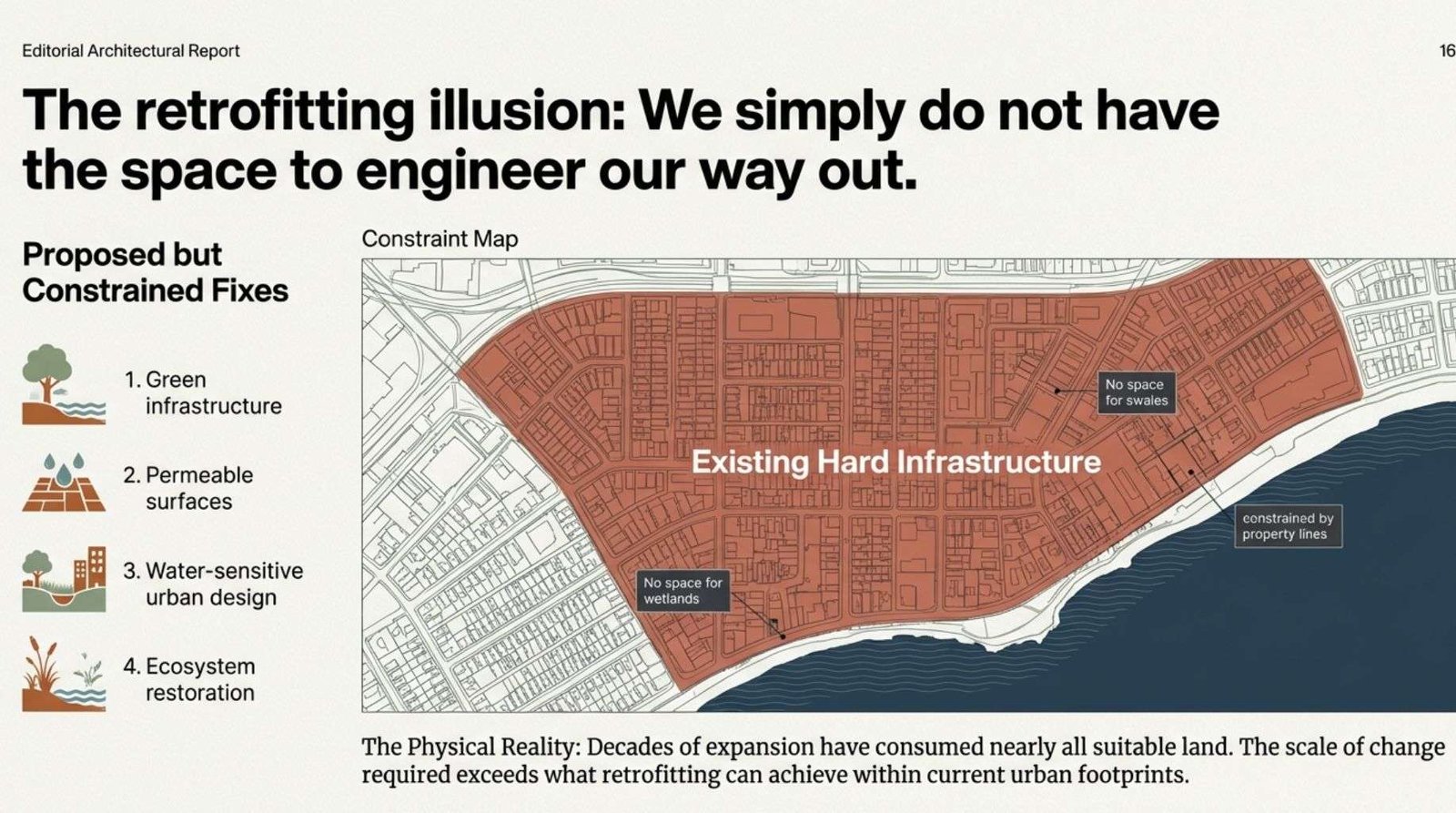 4. Retrofitting existing coastal development faces severe constraints because most coastal land has already been developed, leaving minimal space for large-scale green infrastructure or water-sensitive redesign.